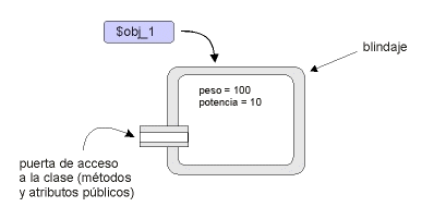 El atributo $velocidadMaxima sólo será accesible desde el interior de la clase, no desde el exterior. La única forma de acceder a esta característica del objeto es a través de la interfaz pública: métodos getVelocidadMaxima() y setVelocidadMaxima()